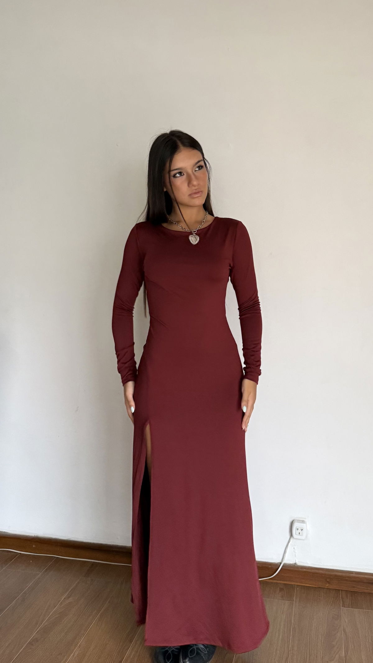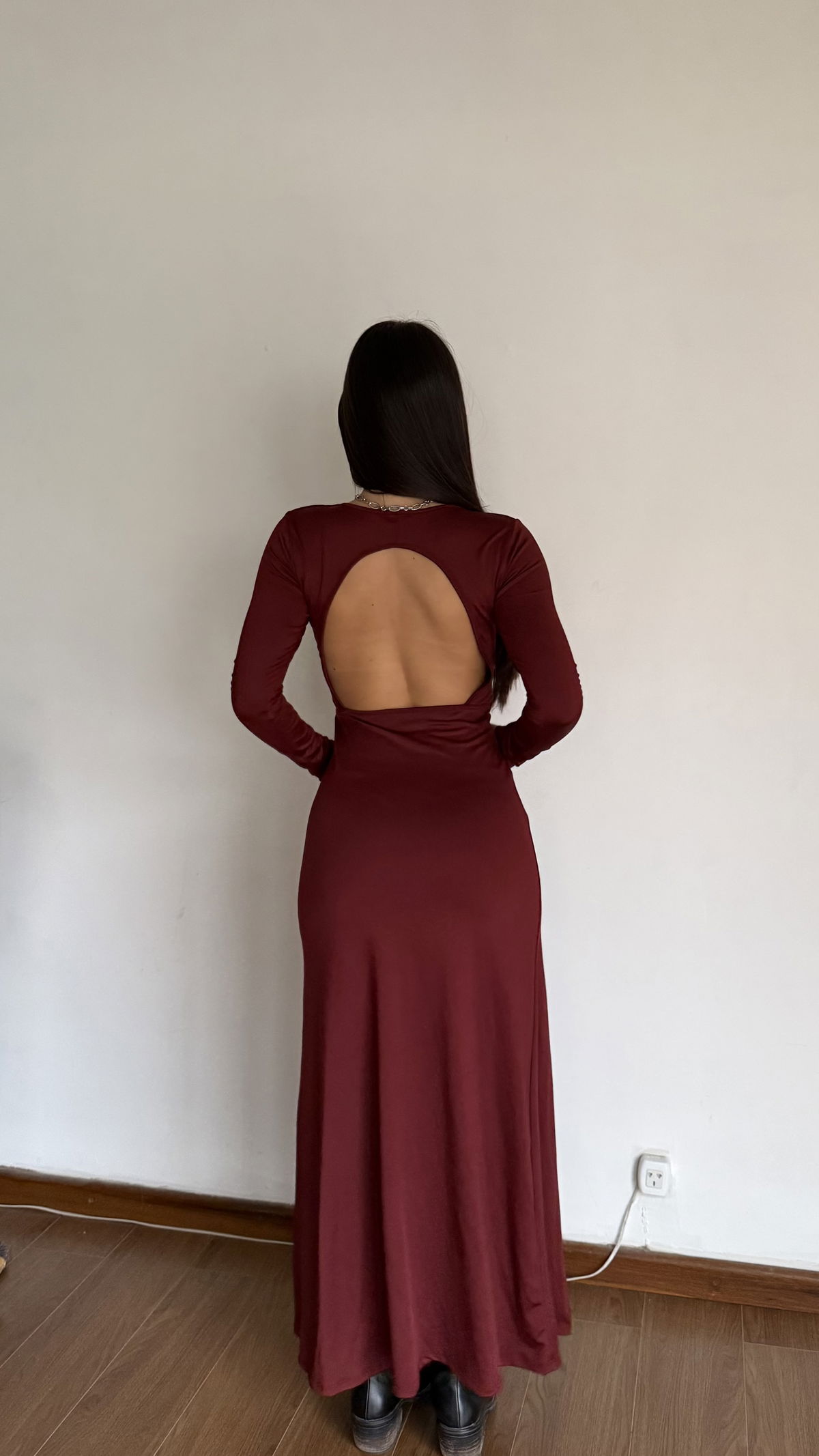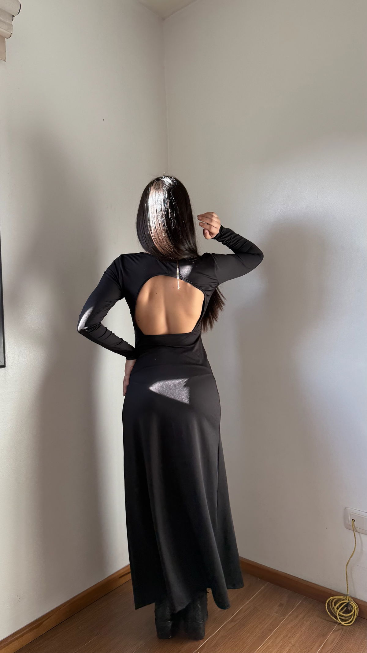 vestido largo manga larga con espalda desc