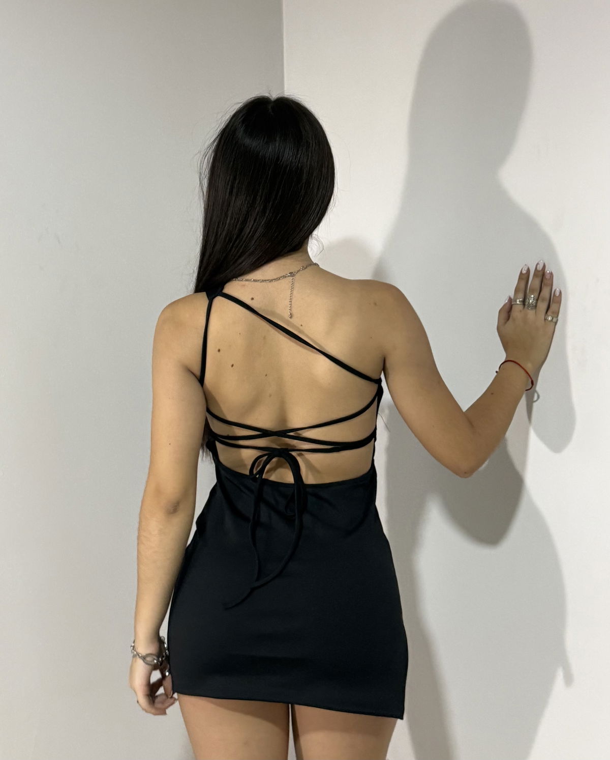 vestido corto un hombro con espalda para atar