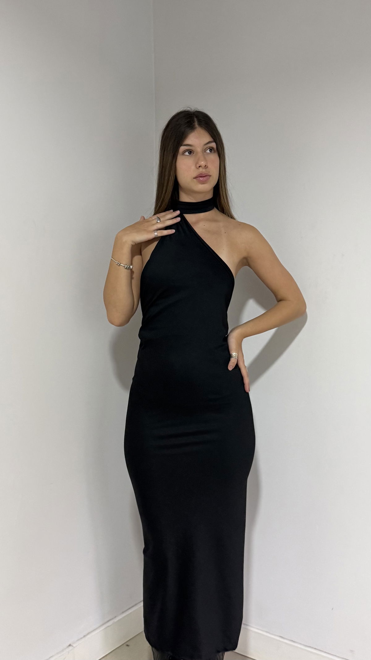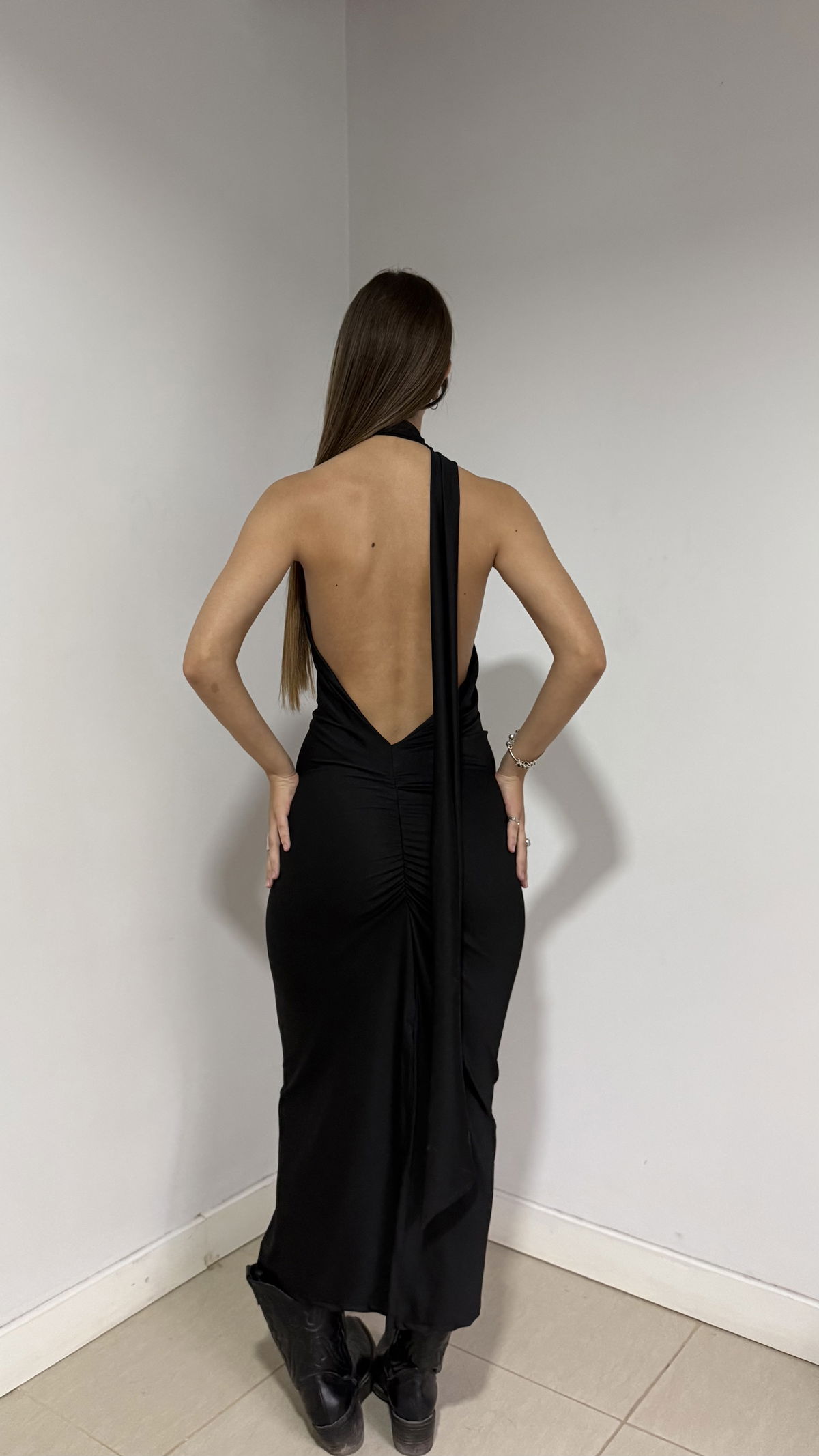 vestido largo asimétrico con corbata y espalda desc