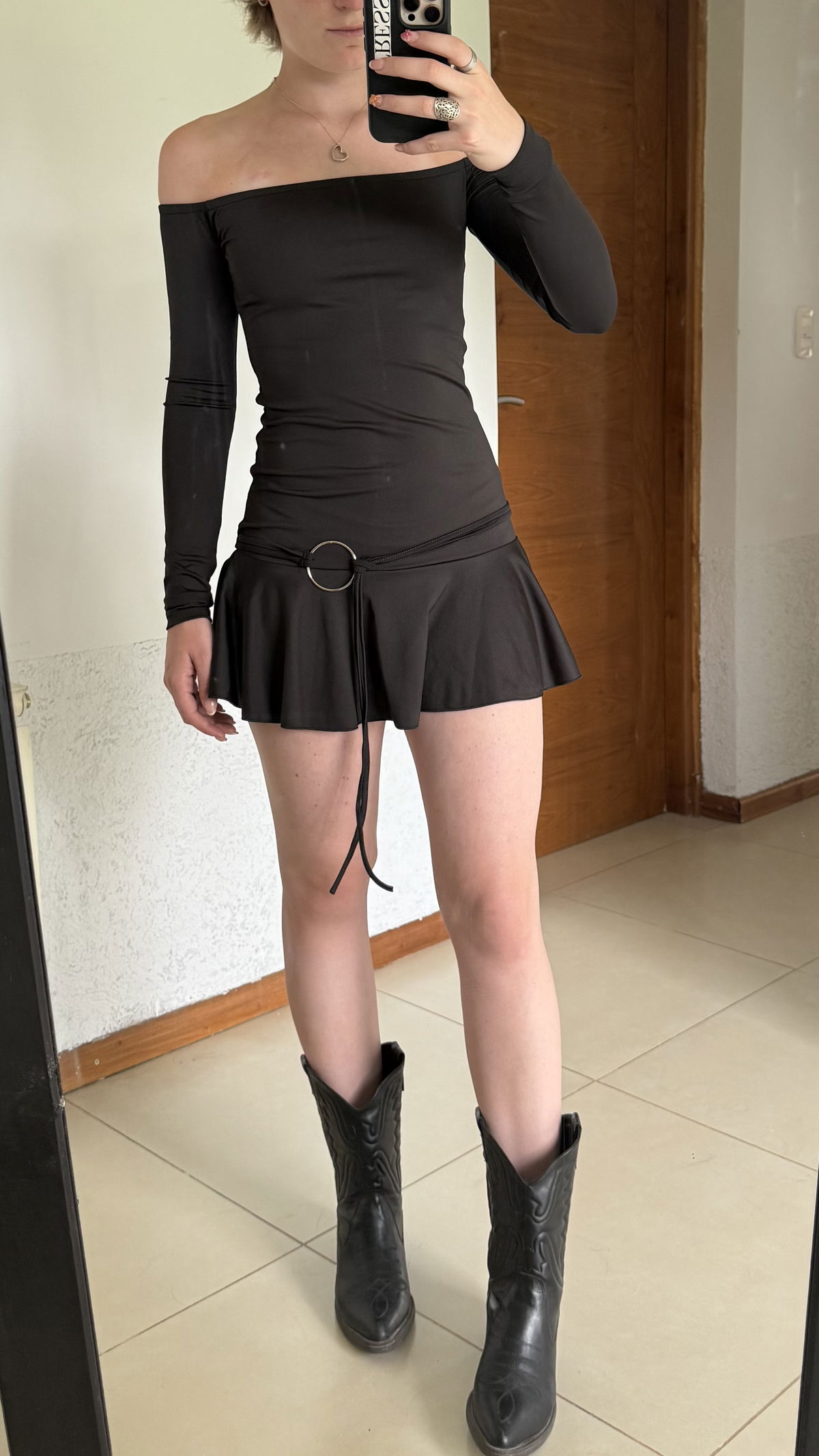 vestido corto cuello bote manga larga con volados
