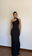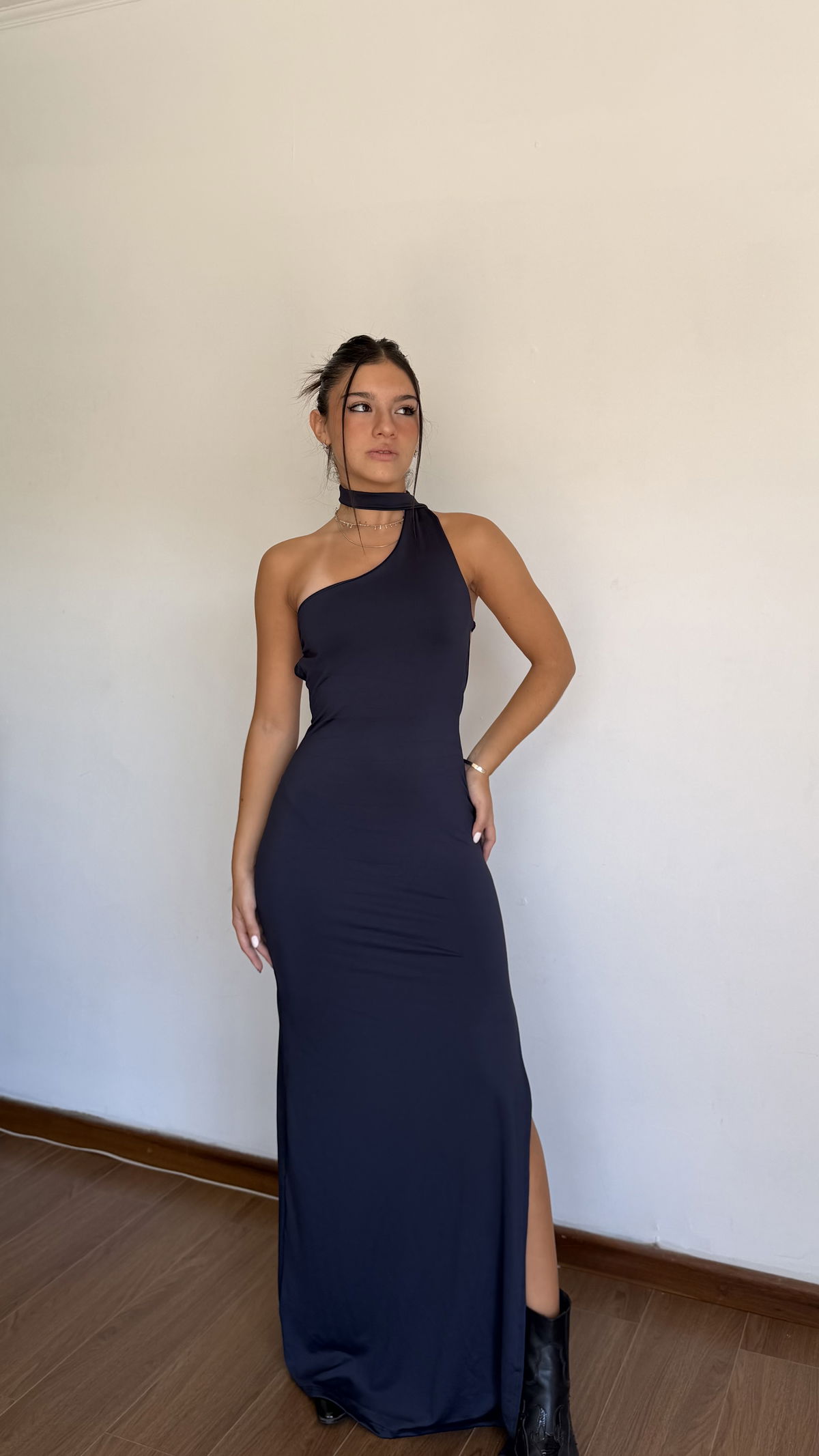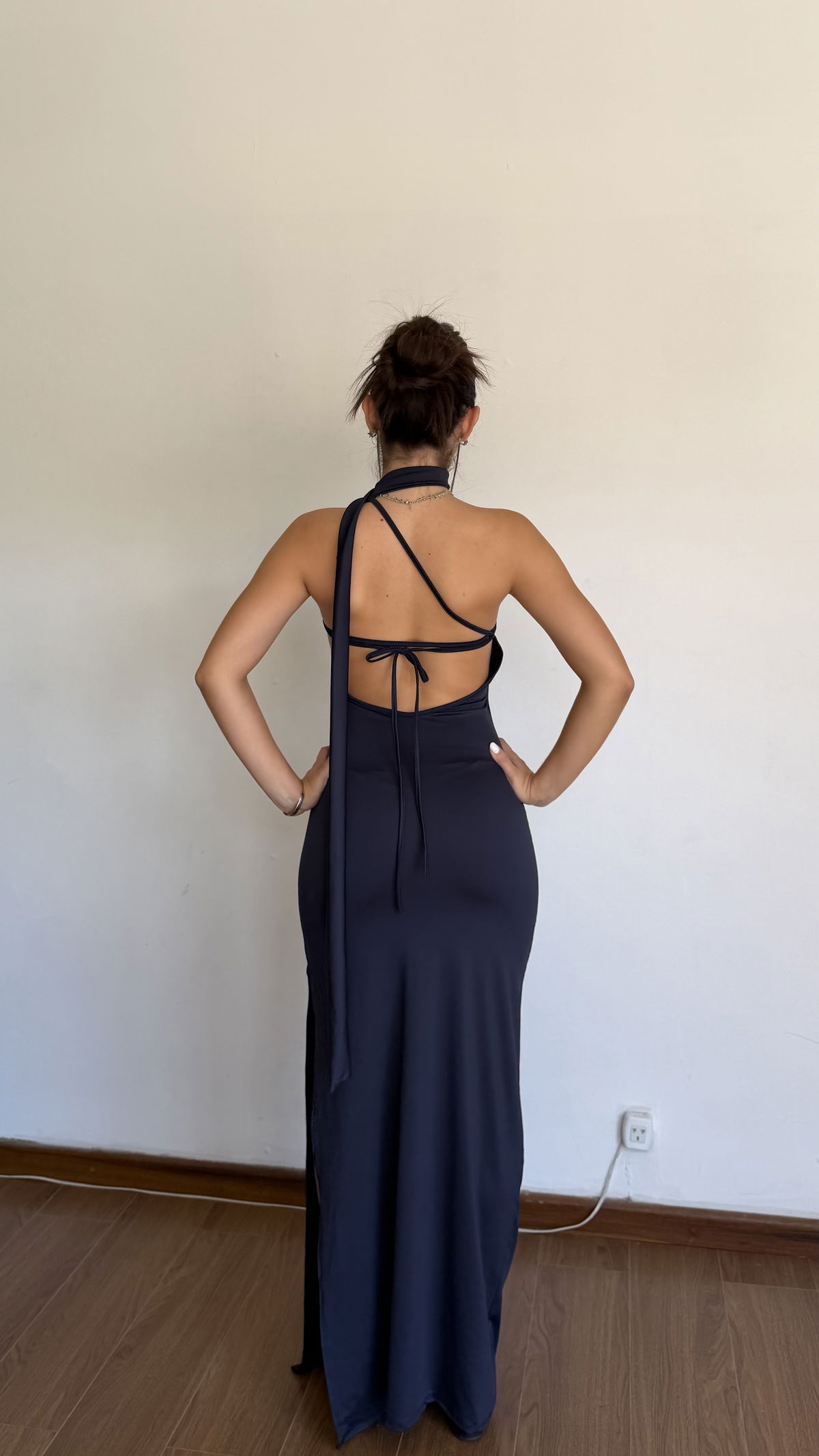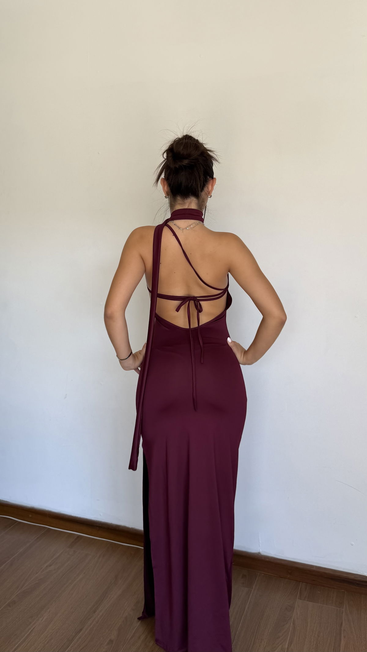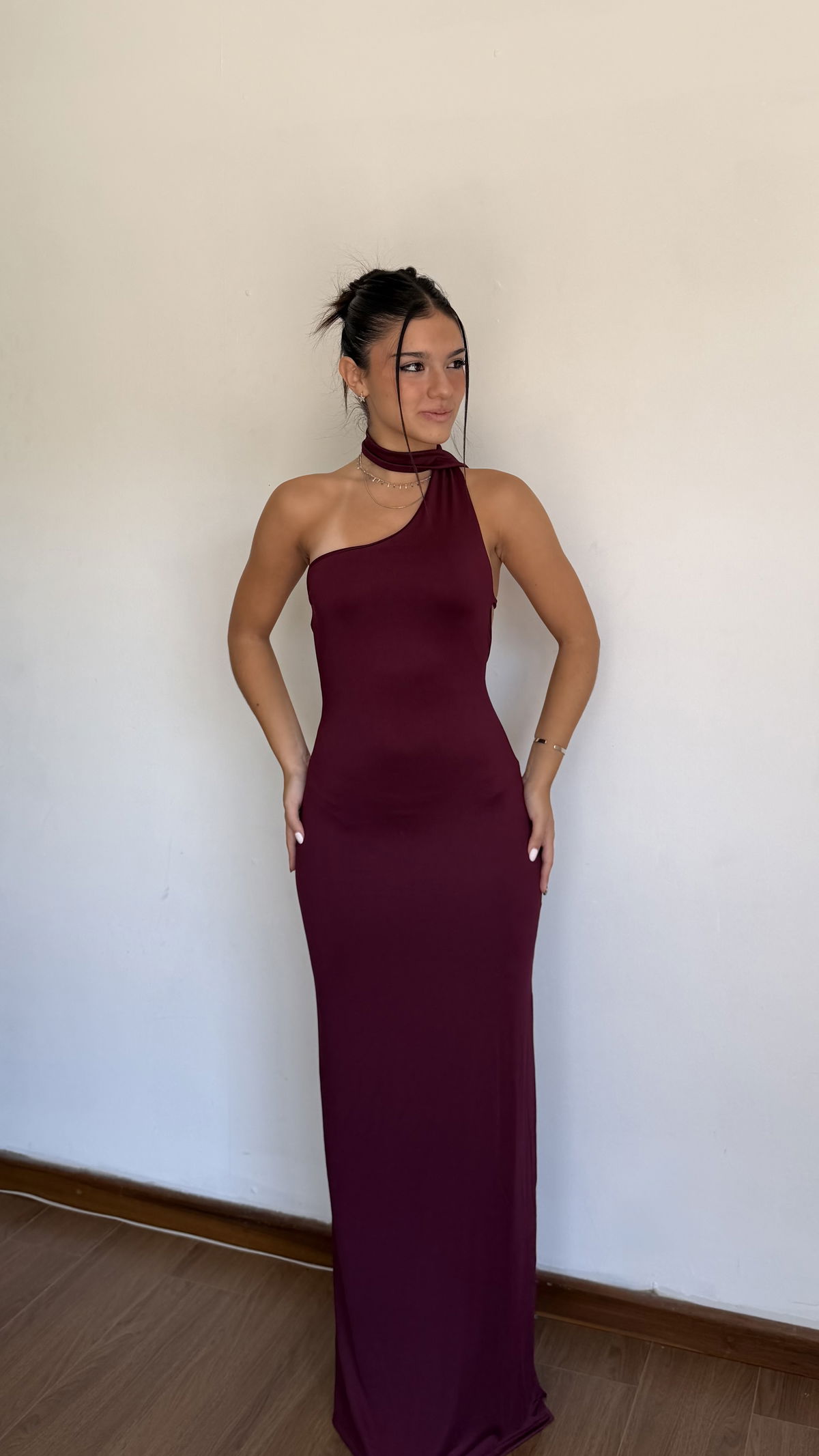vestido largo un hombro con bufanda y espalda con tira